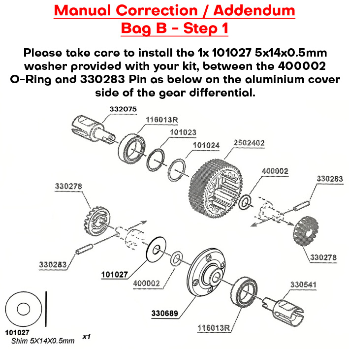 One point of note On the S12-3C (Carpet) car, the manual doesn’t show the supplied 1x SW-101027 5x14x0.5mm Shim that should be installed between the SW-400002 O-Ring and SW-330283 Pin, which should be installed on the Aluminium Diff Cover Plate side of the gear differential. We built the diff in 2 gear configuration rather than the illustrated 4 gear, and used 50,000CPS XTR Diff Oil and also used the tried and tested XTR Lithium Grease on the diff outdrives (XTR-0143).