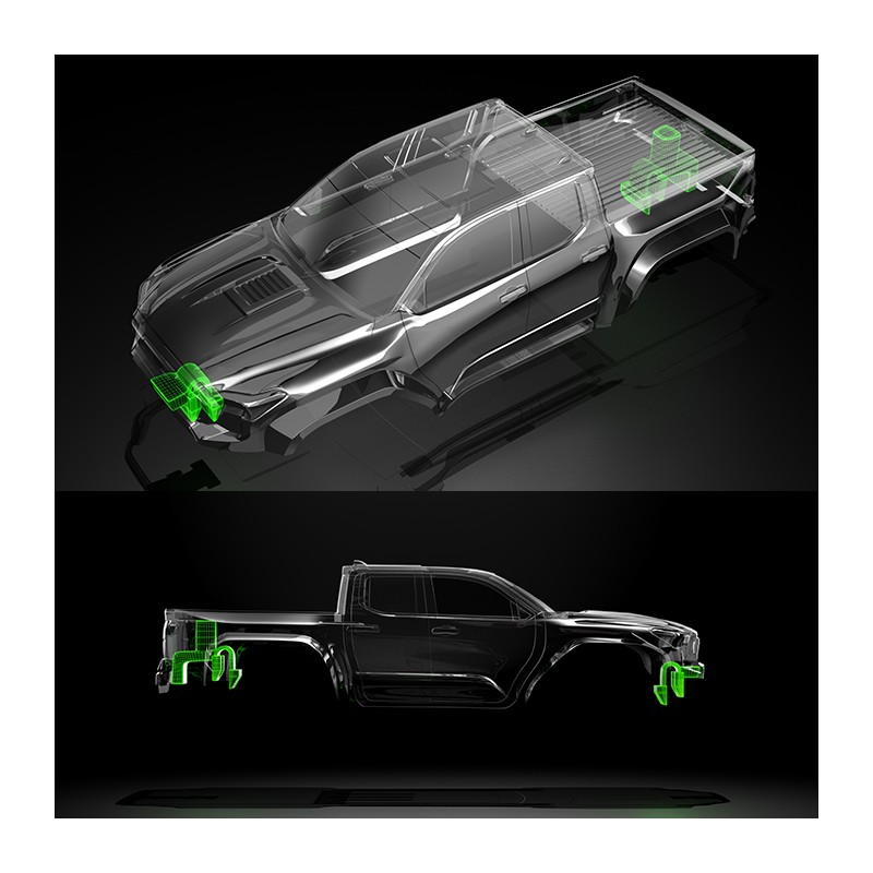 The idea behind this bodyshel project was to offer something totally different from the rigid, heavy and non-customisable bodies supplied by Traxxas in the box kit. We identified two modern off-road vehicles that are totally different from each other, and thanks to careful design, we offer two bodies, sold transparent and customisable to your liking, which are perfectly “Plug & play” with the original: after painting it, simply unhook the standard body with a click and hook one of ours with a clack!