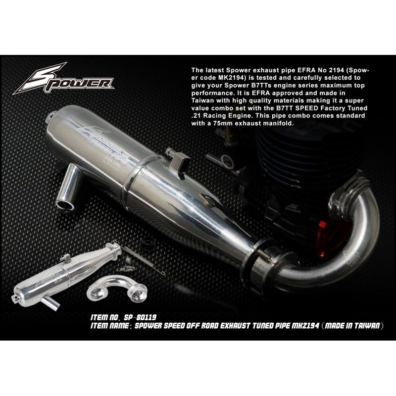 The latest Spower exhaust pipe EFRA No. 2194 (Spower code MK2194) has been tested and carefully selected to provide your Spower B7TTs engine series with maximum top performance. The pipe is EFRA-approved and manufactured in Taiwan from high-quality materials, making it the perfect combo set with the B7TT SPEED Factory Tuned .21 Racing Engine.