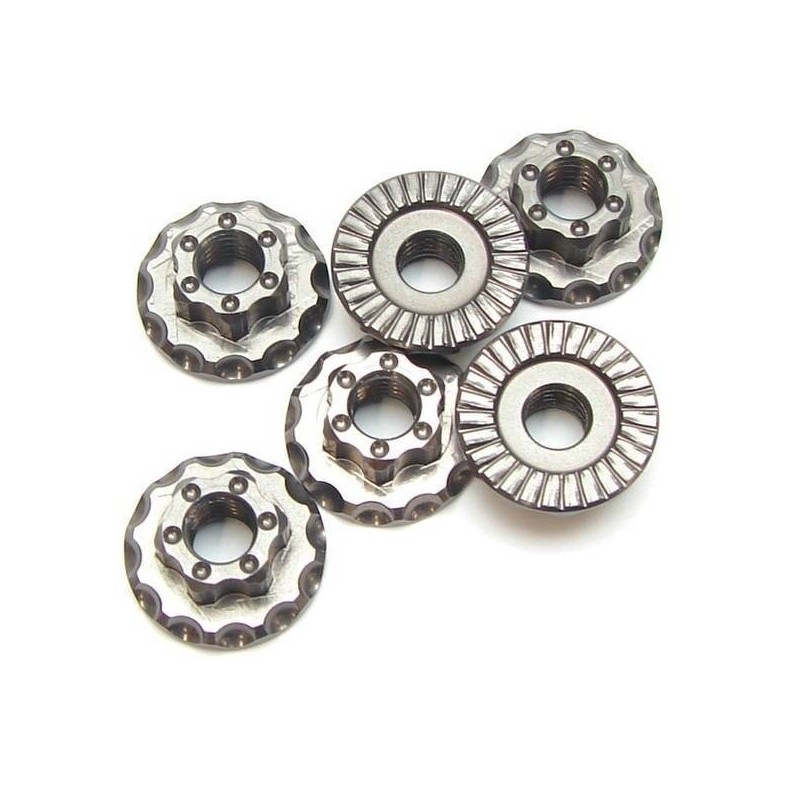 The SWORKz 1/10 4mm serrated wheel nut is made from T-7075 aluminum. It is lightweight with a large contact area which can prevent the wheel coming loose during high speed carpet racing.